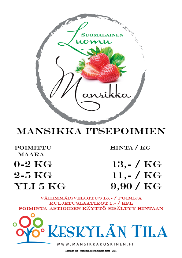 Huom! Mansikan itsepoiminta vuonna 2025 Keskylän tilalla on lopetettu sadon vähäisyyden vuoksi. Mansikkaa ei siis enää ole tarjolla itsepoimittavaksi kesällä 2025.
