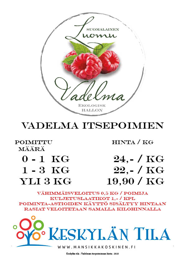 Vadelman itsepoiminnan hinta on 19,90-24 € / kg. Hinta sisältää poiminta-astioiden käytön.
